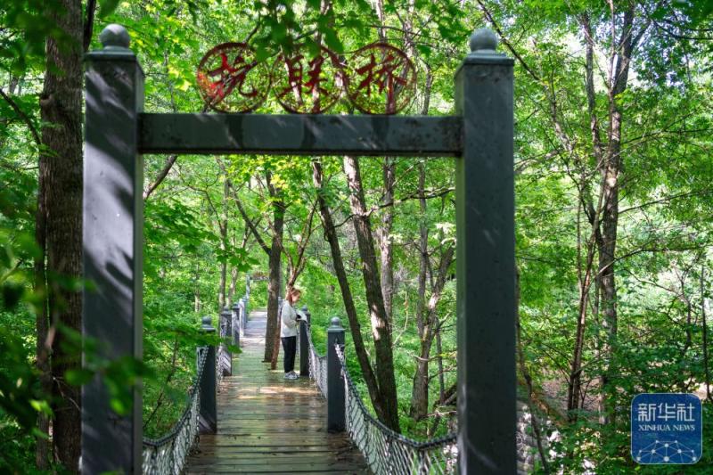 6月17日,在七星山国家森林公园,游客走过抗联影视基地中的抗联桥。