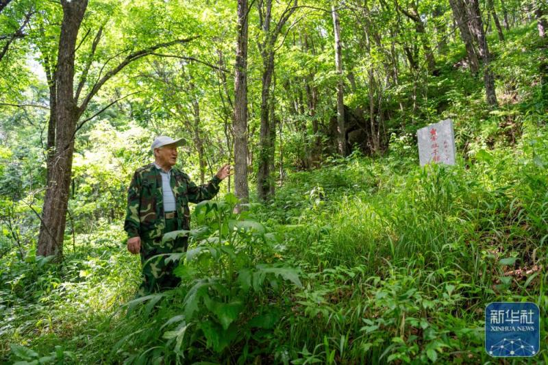 6月17日,在七星砬子抗联密营遗址内,集贤县革命老区建设促进会会长朴永鹤介绍抗联十一军军政干部学校遗址。