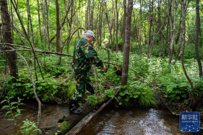 6月17日,在七星山国家森林公园,集贤县革命老区建设促进会的工作人员在林间寻找东北抗联遗址。