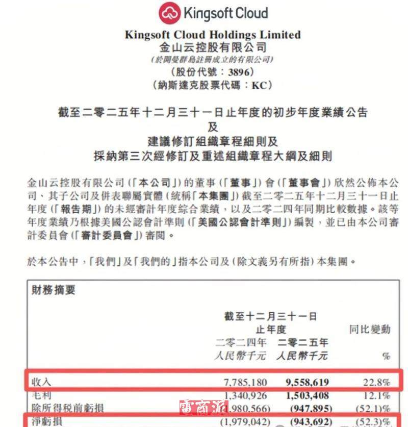 公告发布同日,金山云交出了一份颇为亮眼的2025年成绩单,全年总收入约95.6亿元,同比增长22.8%;净亏损约9.4亿元,同比大幅收窄52.30%。